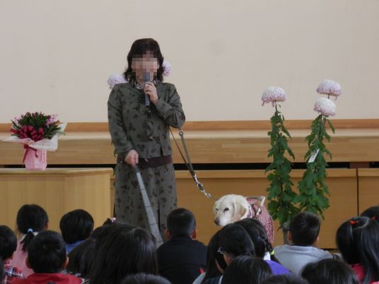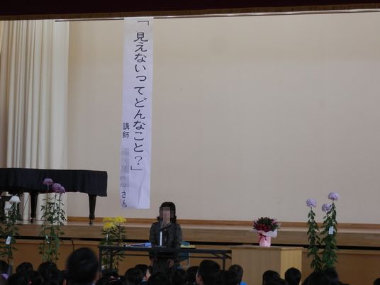 これを、全校・全学年が学習します。講師として、近郊にお住まいの全盲の方を招き、体験談などを子供たちはもちろん、同席している親たちに向けてもお話しいただきました。